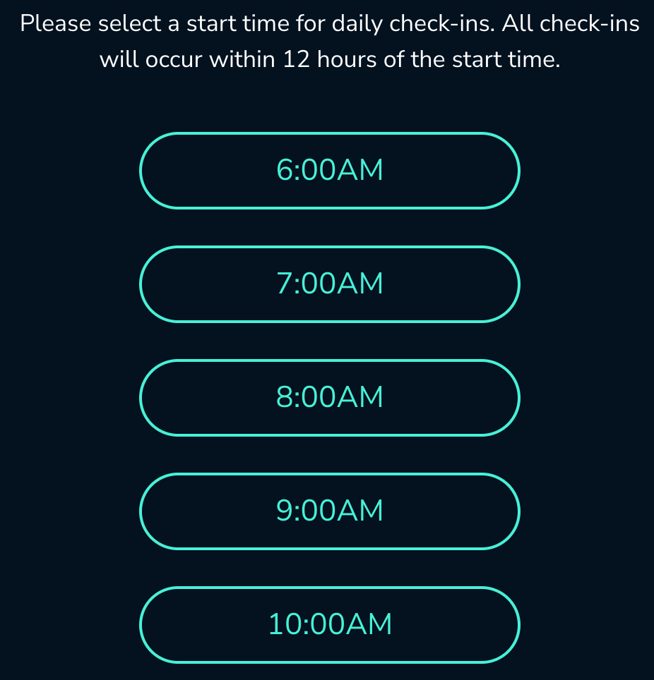 - Select a start time for your daily notifications. Keep in mind that the last notification will arrive roughly 12 hours after the first one. So if you select 6am as your start time, the last notification will arrive around 6pm. Likewise, if you select 10am, the last notification will will arrive around 10pm.